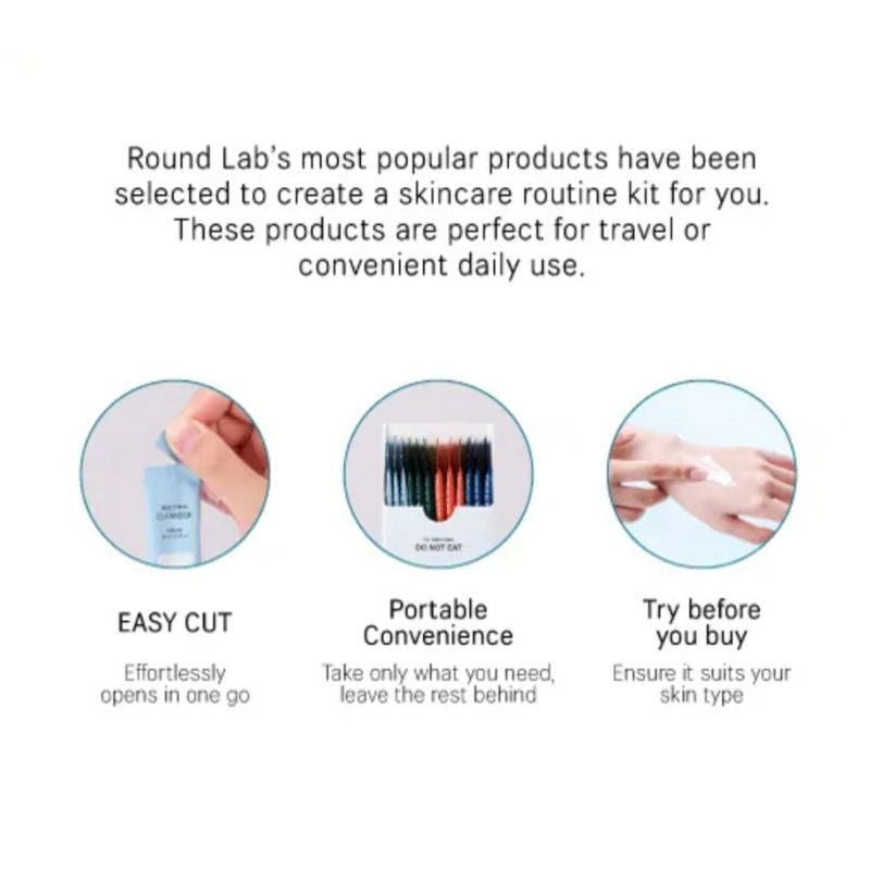 Compact, hygiénique et facile à emporter, le Stick Pouch Kit ROUND LAB vous offre l’expérience complète du skincare coréen — à la maison comme en déplacement.