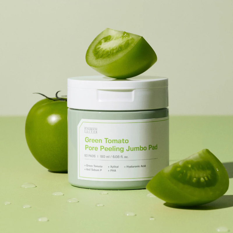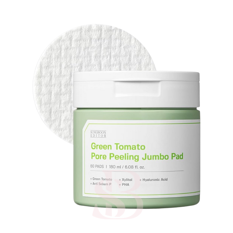 The Green Tomato Pore Peeling Jumbo Pore Pad provides gentle yet effective exfoliation to minimize and tighten pores while deeply hydrating skin. Enriched with patented Green Tomato Extract, PHA, and Hyaluronic Acid, these 60 jumbo pads effortlessly remove dead skin cells, refine skin texture, and balance moisture for a radiant complexion.