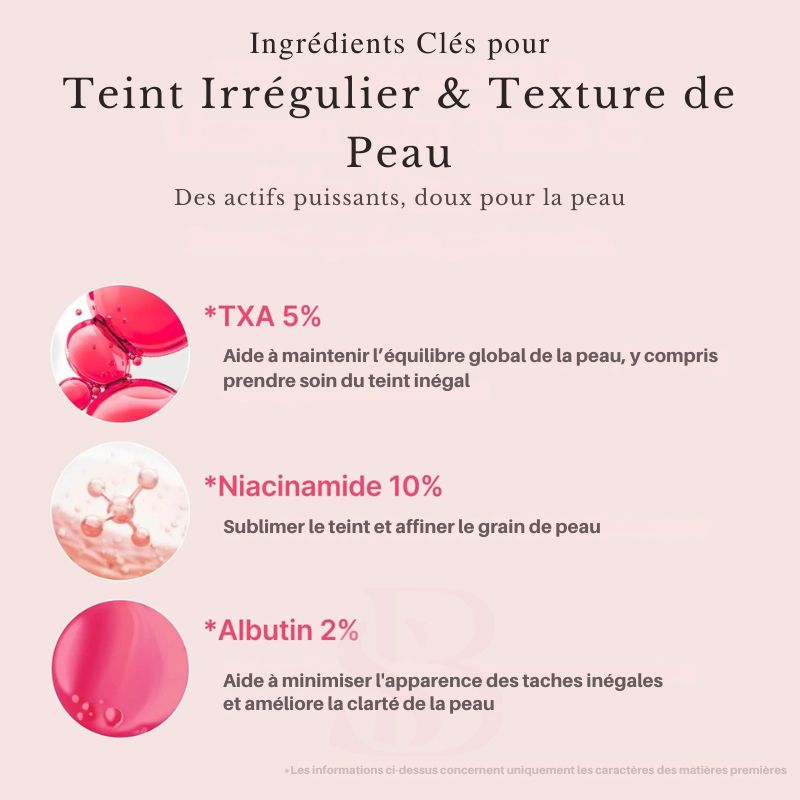 Un sérum « tout-en-un » ultra-léger et sans parfum, formulé pour durer 72 heures. Enrichi en 10 types d’acides hyaluroniques, panthénol et bétaïne pour une hydratation profonde et un apaisement durable. Avec 5 % d’acide tranéxamique (TXA), la concentration la plus élevée de Medicube pour cibler taches brunes et cicatrices d’acné, tout en préservant l’équilibre cutané.